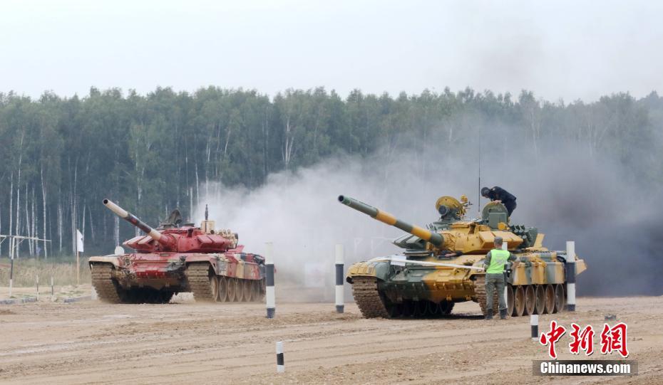 当地时间9月5日,俄罗斯队坦克(红色)和阿塞拜疆队坦克(黄色)正在进行“坦克两项”比赛。“坦克两项”是“国际军事比赛”的最重要项目之一。当天“国际军事比赛-2020”在莫斯科郊外闭幕。 中新社记者 王修君 摄