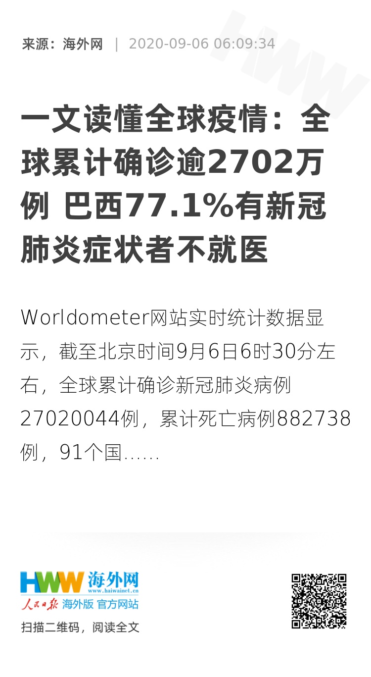 海外网9月6日电 Worldometer网站实时统计数据显示,截至北京时间9月6日6时30分左右,全球累计确诊新冠肺炎病例27020044例,累计死亡病例882738例,91个国家确诊病例超过万例。