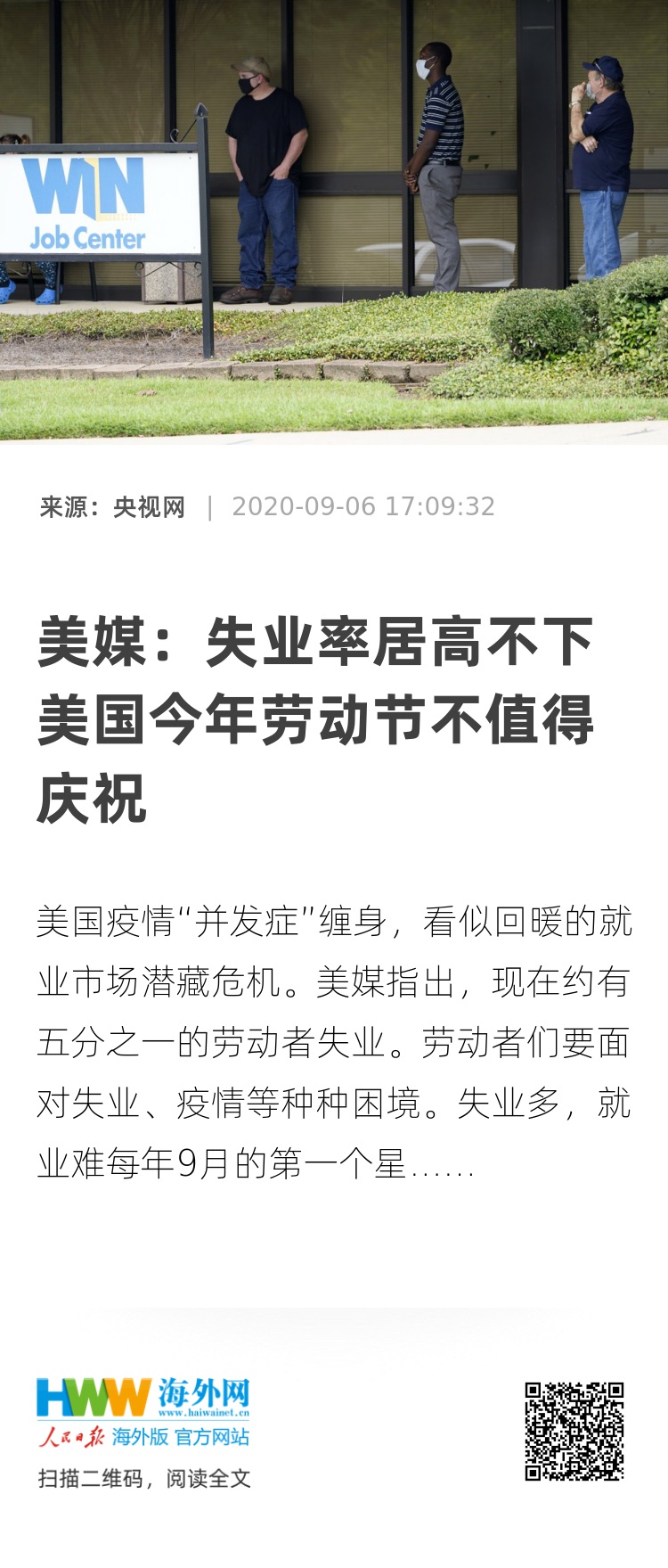 每年9月的第一个星期一是美国的劳动节,当天会放假一天来纪念劳动者对经济发展的贡献。然而,目前美国仍有约2800万人正在领取失业救济金,这些人数大约占了美国劳动者的五分之一。哥伦比亚广播公司发文称,对于美国的劳动者而言,今年的劳动节没有什么可庆祝的。