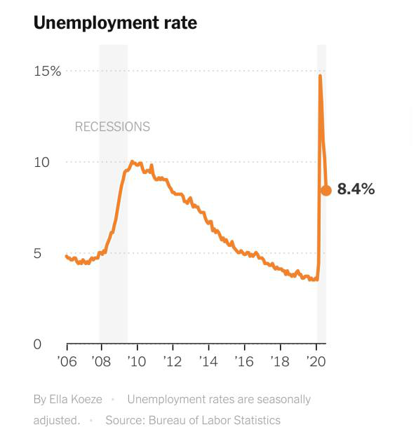 疫情暴发后,美国失业率在4月份飙升至14.7%,创下自1948年政府开始追踪失业数据以来的最高纪录,此后一直居高难下。当地时间4日,美国劳工部发布的报告显示,8月份全美失业率降到了10%以下,为8.4%。但报道指出,美国实际就业情况依然严峻。