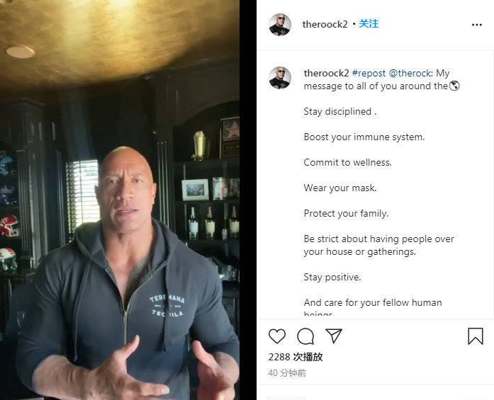 △美国演员道恩·强森及其家人确诊新冠肺炎,他在社交媒体上呼吁人们注意防疫