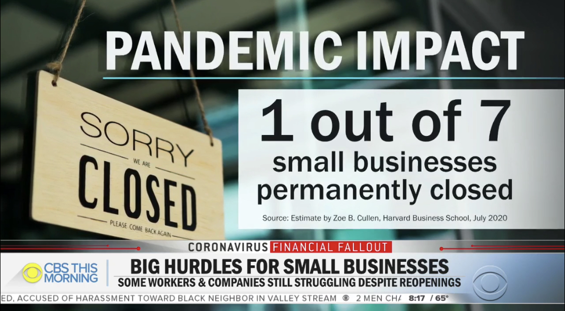 △哈佛大学商学院7月数据显示:美国七分之一小企业永久倒闭 哥伦比亚广播公司报道