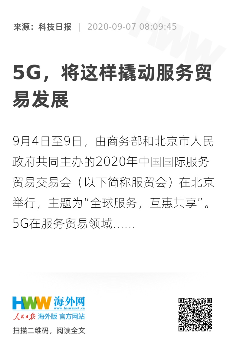 9月4日至9日,由商务部和北京市人民政府共同主办的2020年中国国际服务贸易交易会(以下简称服贸会)在北京举行,主题为“全球服务,互惠共享”。