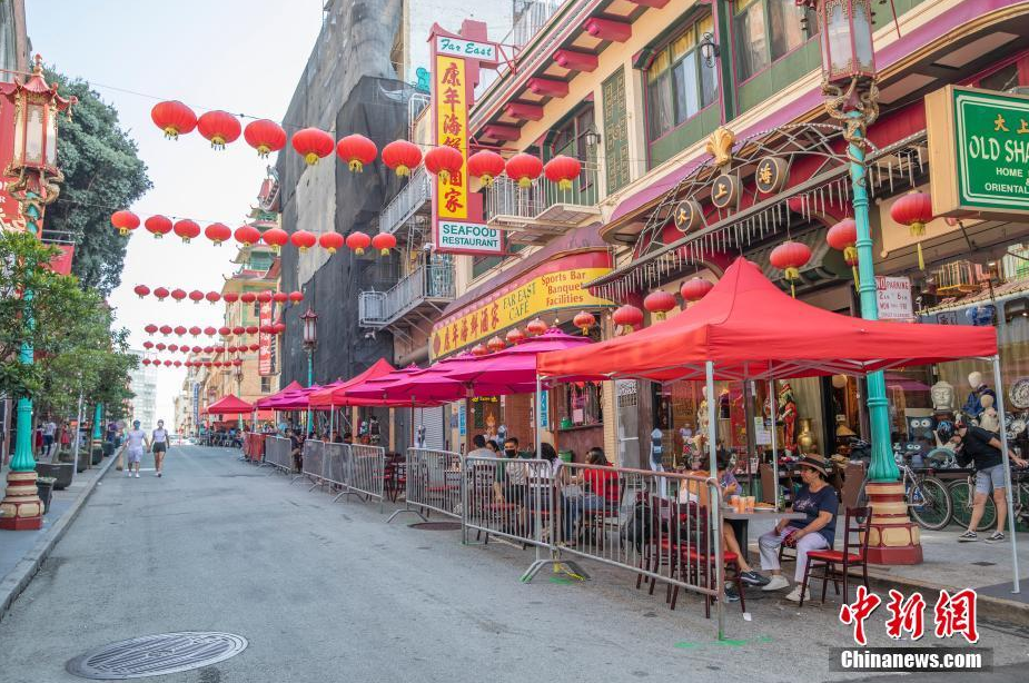 当地时间9月6日,顾客在美国旧金山唐人街街头用餐。为促进经济复苏,近期,旧金山唐人街的部分路段在周末成为步行街,餐饮从业者可以将桌椅放在路上接待客人。 中新社记者 刘关关 摄