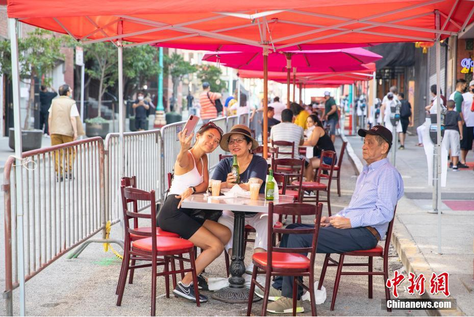 当地时间9月6日,顾客在美国旧金山唐人街街头用餐。为促进经济复苏,近期,旧金山唐人街的部分路段在周末成为步行街,餐饮从业者可以将桌椅放在路上接待客人。 中新社记者 刘关关 摄