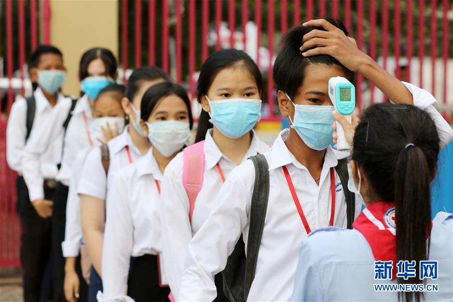 9月7日,柬埔寨金边一所高中的学生返校复课时排队接受体温检测。 新华社发(索万纳拉摄)