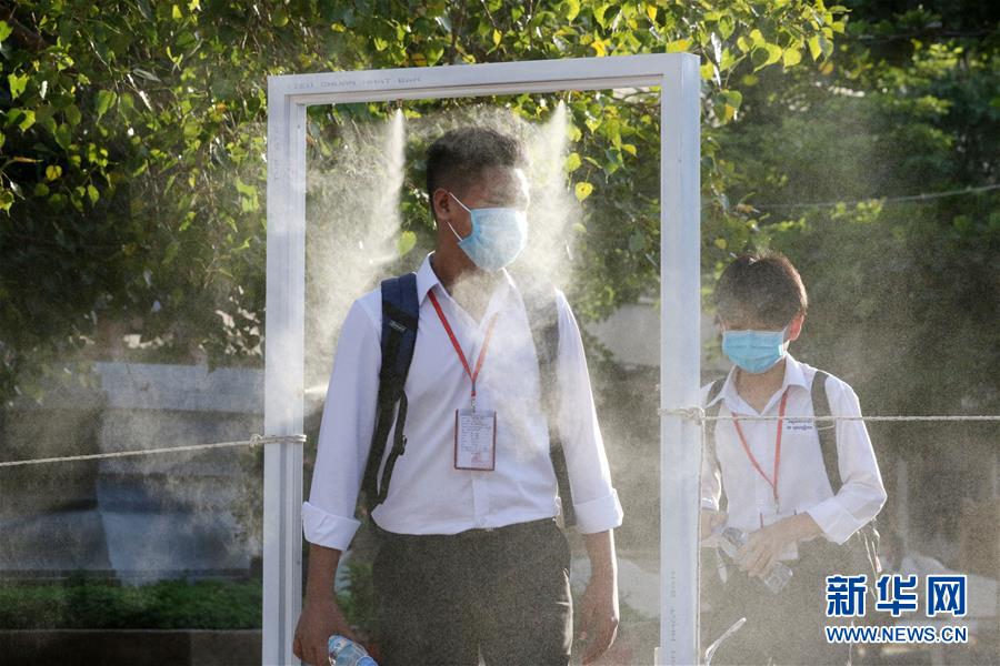 9月7日,柬埔寨金边一所高中的学生返校复课时走过消毒喷雾。 新华社发(索万纳拉摄)