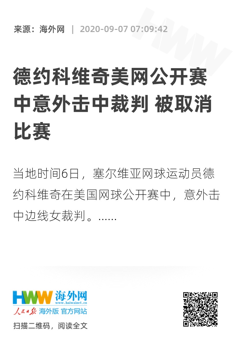 海外网9月7日电 当地时间6日,塞尔维亚网球运动员德约科维奇在美国网球公开赛中,意外击中边线女裁判,被取消美网参赛资格。