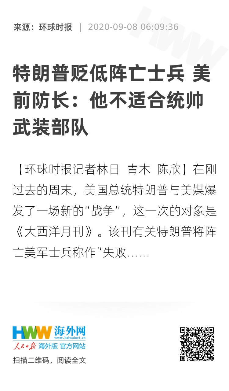 【环球时报记者林日 青木 陈欣】在刚过去的周末,美国总统特朗普与美媒爆发了一场新的“战争”,这一次的对象是《大西洋月刊》。该刊有关特朗普将阵亡美军士兵称作“失败者”和“笨蛋”的爆炸性报道,遭到特朗普的激烈反击,从指责该刊是“失败的激进左翼杂志”到怒骂其由骗子经营。但《大西洋月刊》总编辑杰弗里·戈德伯格6日称,该杂志关于特朗普贬低军人的故事只是“冰山一角”。在任何一个国家都很难想象,军队最高领导人这样形容阵亡军人。美国前国防部长哈格尔直言,如果报道属实,特朗普不适合做美国的三军统帅。对于特朗普来说,比与媒体战争更重要的是,军人是他竞选的核心支持者。拜登阵营已经开始利用此事大做文章,推出展示拜登支持军方的广告。“大选就是一部美剧,”德国《柏林日报》评论说,现在比拼的已经不再是政策,疫情或者外交等都不重要,重要的是指控和反指控。现在还很难说特朗普会输会赢,因为这部剧的真正高潮还没有到来。