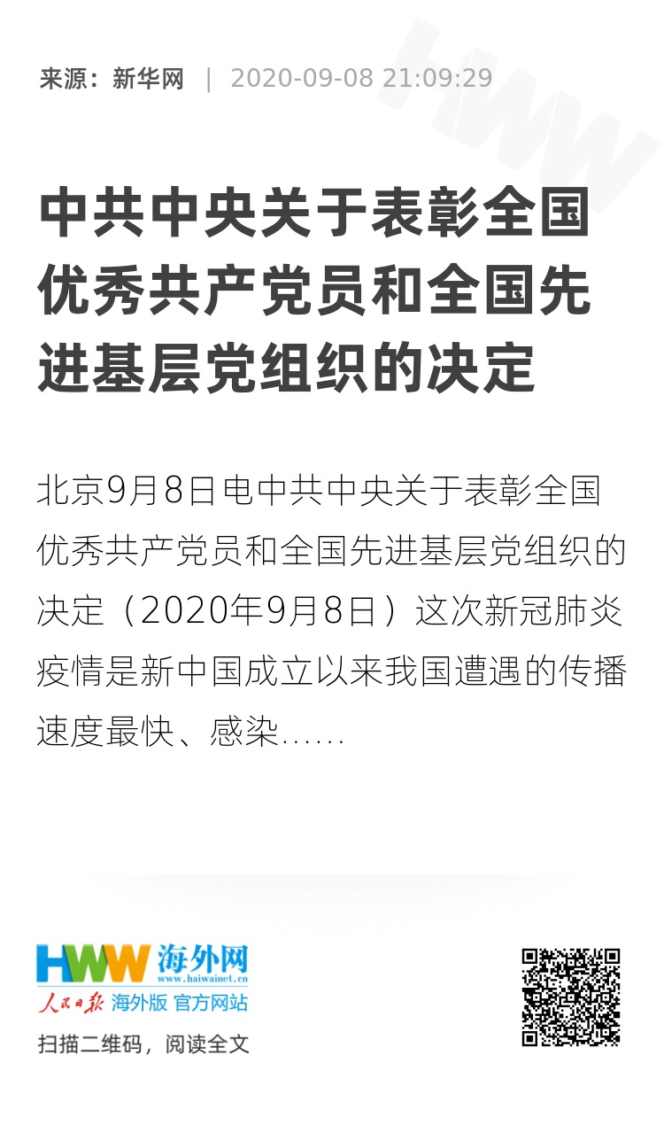 这次受表彰的全国优秀共产党员和全国先进基层党组织,是全国抗击新冠肺炎疫情先进个人和先进集体中的优秀代表。他们的先进事迹和崇高精神,鲜明昭示了我们党坚持全心全意为人民服务的根本宗旨,生动展现了人民至上、生命至上的价值追求,集中体现了中国共产党人敢于斗争、敢于胜利的政治品格,充分彰显了党的严密组织体系的强大组织力、行动力、战斗力。党中央号召,各级党组织和广大党员、干部都要以受表彰的全国优秀共产党员和全国先进基层党组织为榜样,深入学习贯彻习近平新时代中国特色社会主义思想,认真贯彻执行党的理论和路线方针政策,坚定理想信念,对党忠诚;始终把人民放在心中最高位置,坚持不懈为群众办实事、做好事、解难事,保持同人民群众的血肉联系;带头践行社会主义核心价值观,大力弘扬爱国主义、集体主义、社会主义精神,不断激发砥砺前行的奋进动力;始终保持顽强的斗争精神,勇于担当作为,关键时刻冲得上去、危难关头豁得出来、重大斗争中经得起考验,以学先进、争先进、赶先进的实际行动凝聚实现新时代党的历史使命的强大力量。