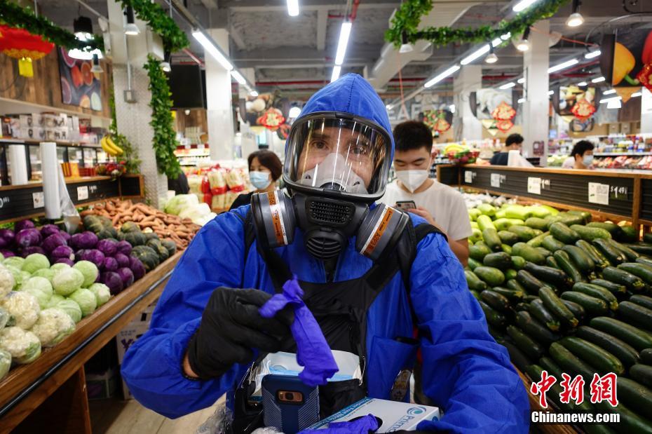 当地时间9月7日,一位市民身着防护服头戴防护面具在纽约皇后区一家超市为顾客发手套、口罩等抗疫物资。美国约翰斯·霍普金斯大学7日发布的新冠疫情最新统计数据显示,美国累计确诊病例已超过629万例。 中新社记者 廖攀 摄