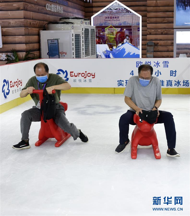9月8日,观众在服贸会综合展区冬季运动专区的一块冰场上进行“速滑”比赛。 2020年中国国际服务贸易交易会9月4日至9日在北京举行。展会上许多项目给观众带来别样的趣味体验。 新华社记者 徐亮 摄