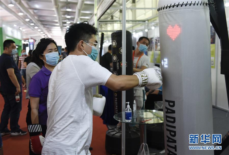 9月8日,参观者在服贸会体育服务专题展区对着一款智能沙袋出拳。 2020年中国国际服务贸易交易会9月4日至9日在北京举行。展会上许多项目给观众带来别样的趣味体验。 新华社记者 徐亮 摄