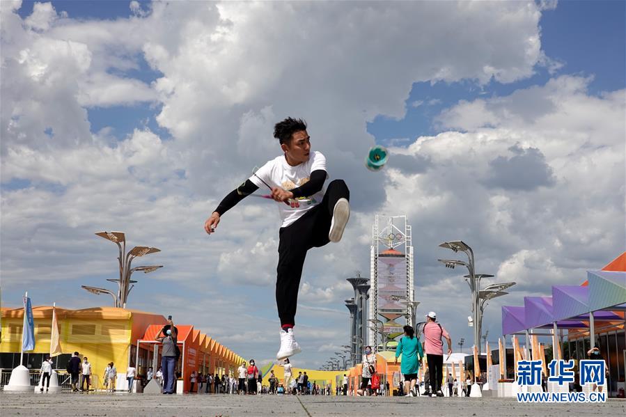9月8日,顺华空竹展台参展人员刘自龙在服贸会展示自制空竹。 2020年中国国际服务贸易交易会9月4日至9日在北京举行。展会上许多项目给观众带来别样的趣味体验。 新华社记者 张笑宇 摄
