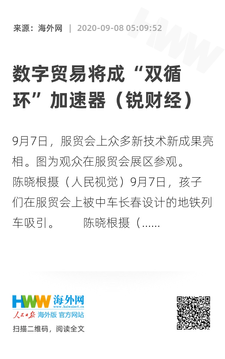记者注意到,在今年服贸会上,不少国内外企业、学者、科研机构都十分关注数字技术应用对服务贸易发展的重要意义。大家普遍认为,尽管疫情影响了人员跨境交流,但数据以及基于数据的服务显示出了更大优势。未来,数字贸易有望为国内国际双循环相互促进提供强大动力。
