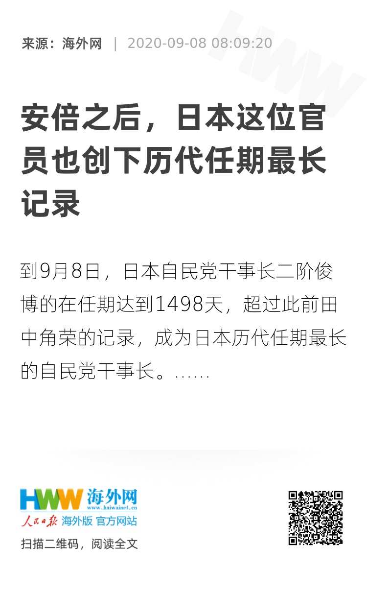 海外网9月8日电 到9月8日,日本自民党干事长二阶俊博的在任期达到1498天,超过此前田中角荣的记录,成为日本历代任期最长的自民党干事长。