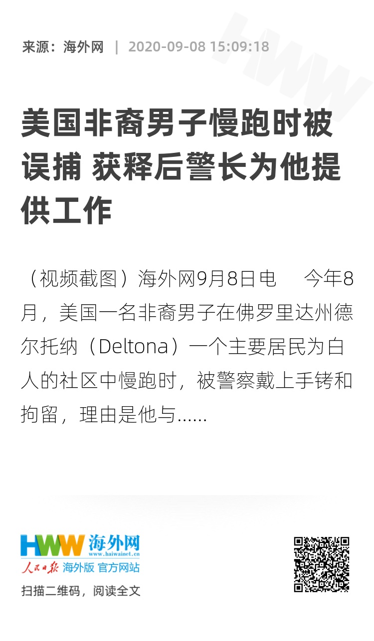 海外网9月8日电 今年8月,美国一名非裔男子在佛罗里达州德尔托纳(Deltona)一个主要居民为白人的社区中慢跑时,被警察戴上手铐和拘留,理由是他与警察寻找的嫌疑人非常相似,随后警方发现抓错人,释放了这名男子并为他提供了一份工作。