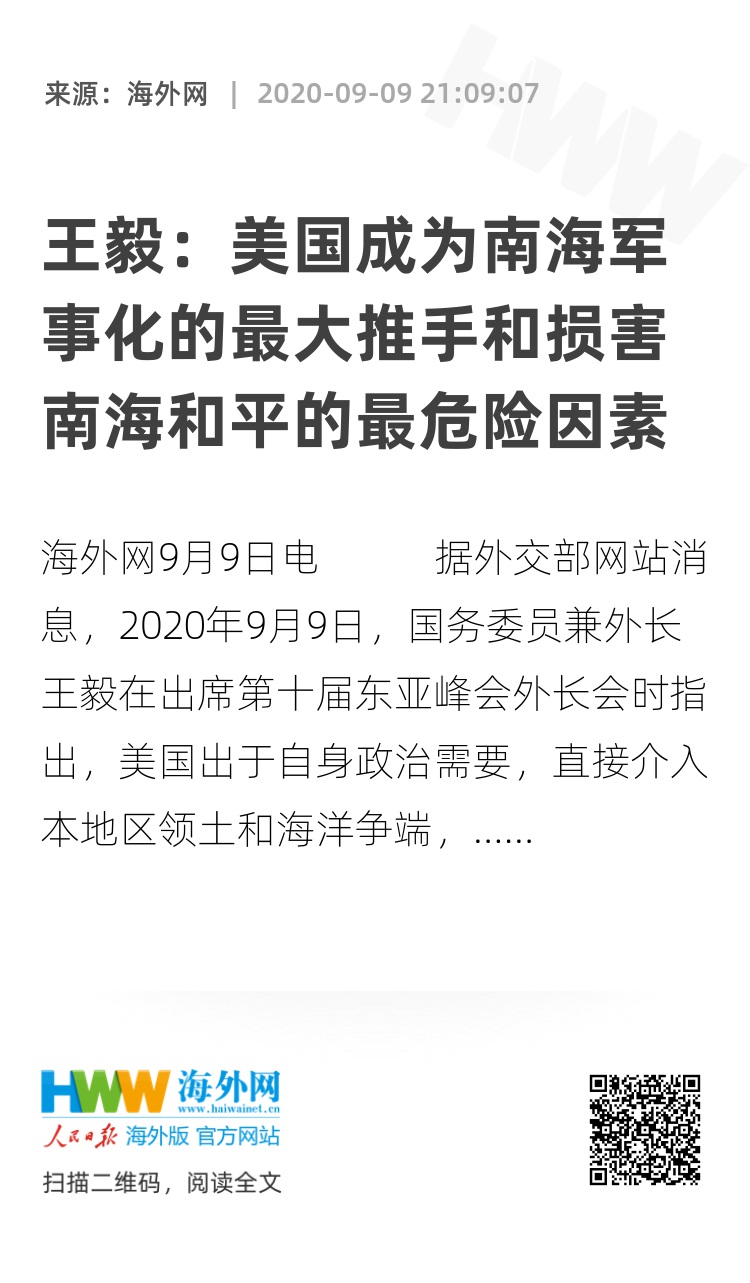 海外网9月9日电 据外交部网站消息,2020年9月9日,国务委员兼外长王毅在出席第十届东亚峰会外长会时指出,美国出于自身政治需要,直接介入本地区领土和海洋争端,不断炫耀武力,强化军事部署,正在成为南海军事化的最大推手。美国干扰中国和东盟国家协商解决争议的努力,挑动地区国家对立对抗,正在成为损害南海和平的最危险因素。