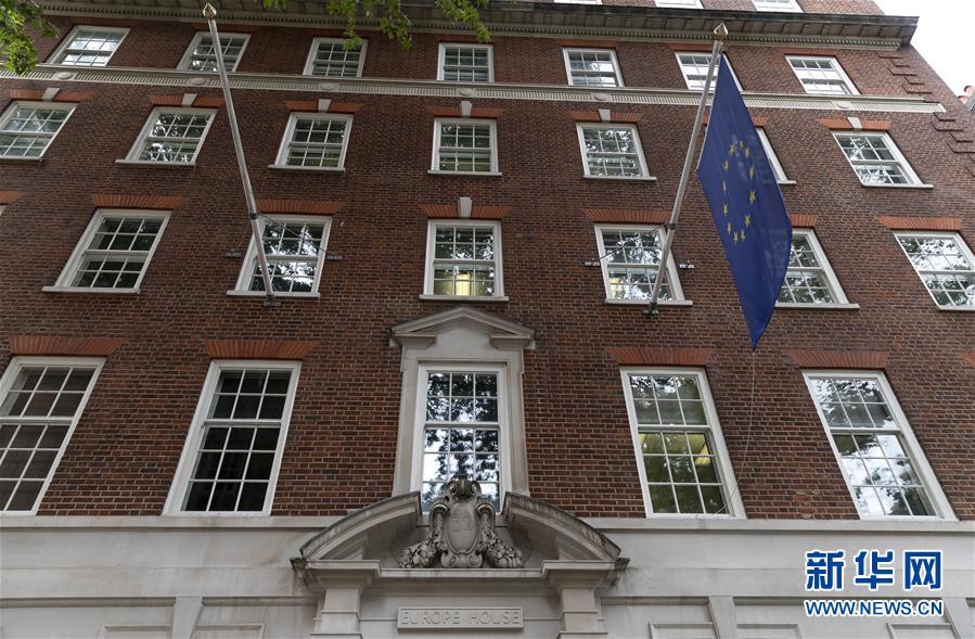 这是9月8日在英国伦敦拍摄的欧洲议会驻英国联络办公室入口处悬挂的欧盟旗帜,英国国旗不再悬挂(“脱欧”前左边旗杆悬挂英国国旗)。 英国和欧盟于8日在伦敦开始新一轮谈判。英国首相办公室6日表示,首相约翰逊认为英国与欧盟需要在10月15日前达成贸易协议,以便协议在年底前生效。 新华社记者 韩岩 摄