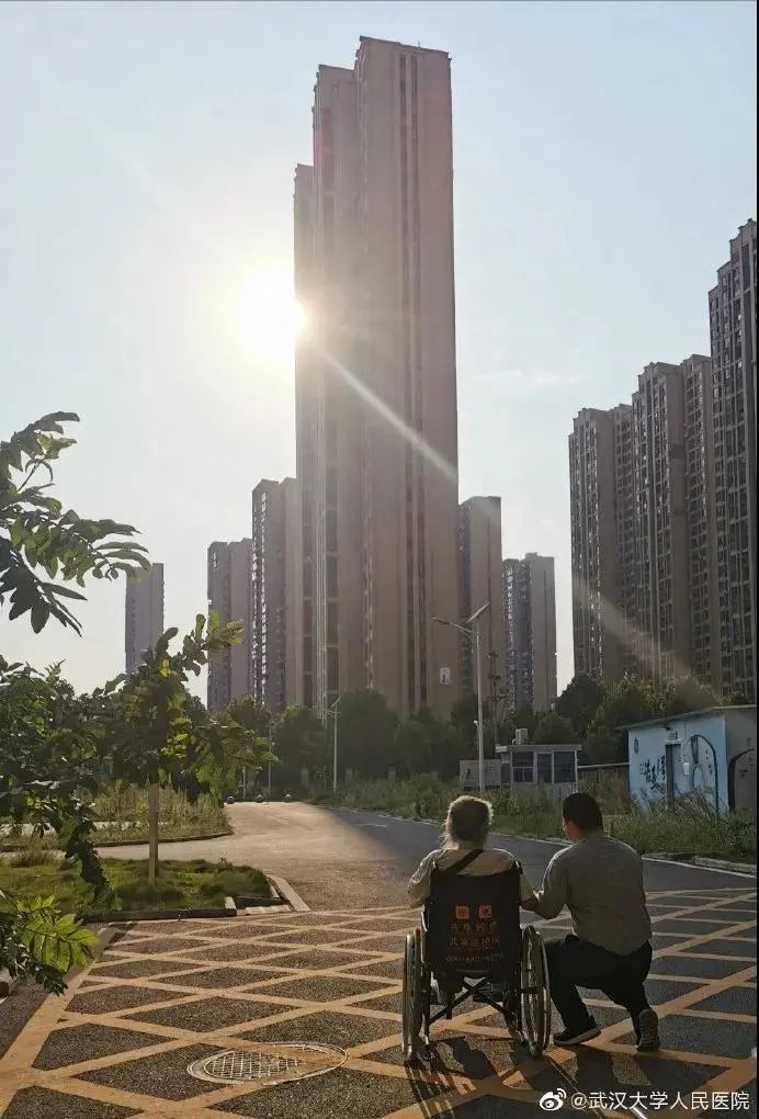 上海支援湖北医疗队医生刘凯在护送87岁老人做检查途中,特意停下让老人欣赏久违的落日。时隔半年,9月4日,照片中的两位主角在武汉大学人民医院东院重逢。