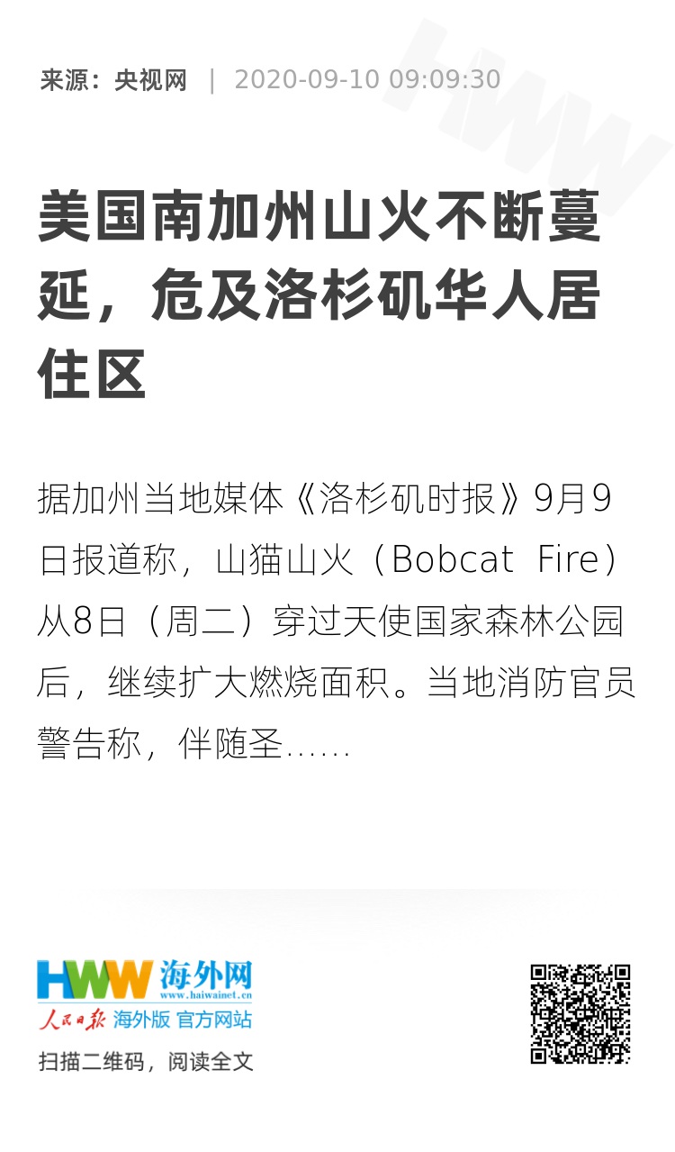 据加州当地媒体《洛杉矶时报》9月9日报道称,山猫山火(Bobcat Fire)从8日(周二)穿过天使国家森林公园后,继续扩大燃烧面积。当地消防官员警告称,伴随圣塔安娜风的到来,大火可能对附近几个华人社区的房屋构成威胁。由于大风天气原因,截至周二(8日)晚间,山猫山火过火面积已超过41平方公里(10344英亩),火势并未得到任何控制,而消防部门已对受山火威胁的几个地区发出火灾红旗警报,并要求当地居民做好随时撤离的准备。