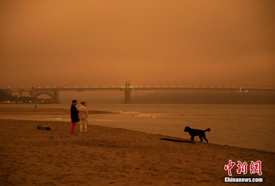 当地时间9月9日中午,美国加利福尼亚州旧金山如夜晚般昏暗,当地居民在海边休闲。北加州多地山火连日燃烧,形成的烟尘四处扩散,造成当地空气质量大幅下降。 中新社记者 刘关关 摄