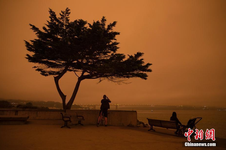 当地时间9月9日中午,美国加利福尼亚州旧金山如夜晚般昏暗。金门大桥被烟尘笼罩。北加州多地山火连日燃烧,形成的烟尘四处扩散,造成当地空气质量大幅下降。 中新社记者 刘关关 摄