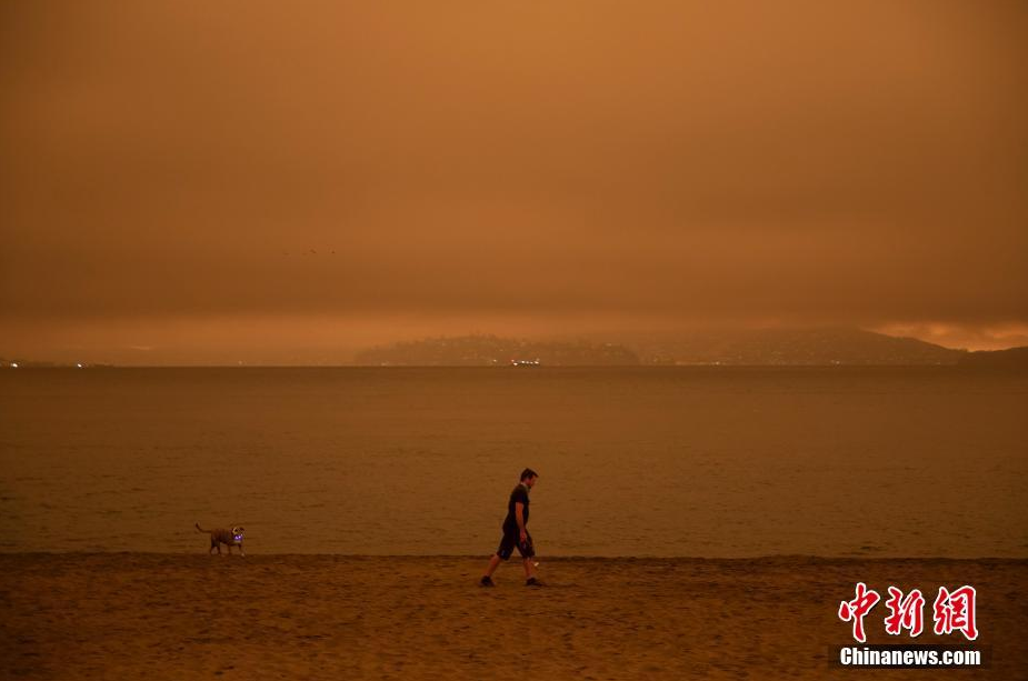 当地时间9月9日中午,美国加利福尼亚州旧金山如夜晚般昏暗,一名男子在海边遛狗。北加州多地山火连日燃烧,形成的烟尘四处扩散,造成当地空气质量大幅下降。 中新社记者 刘关关 摄