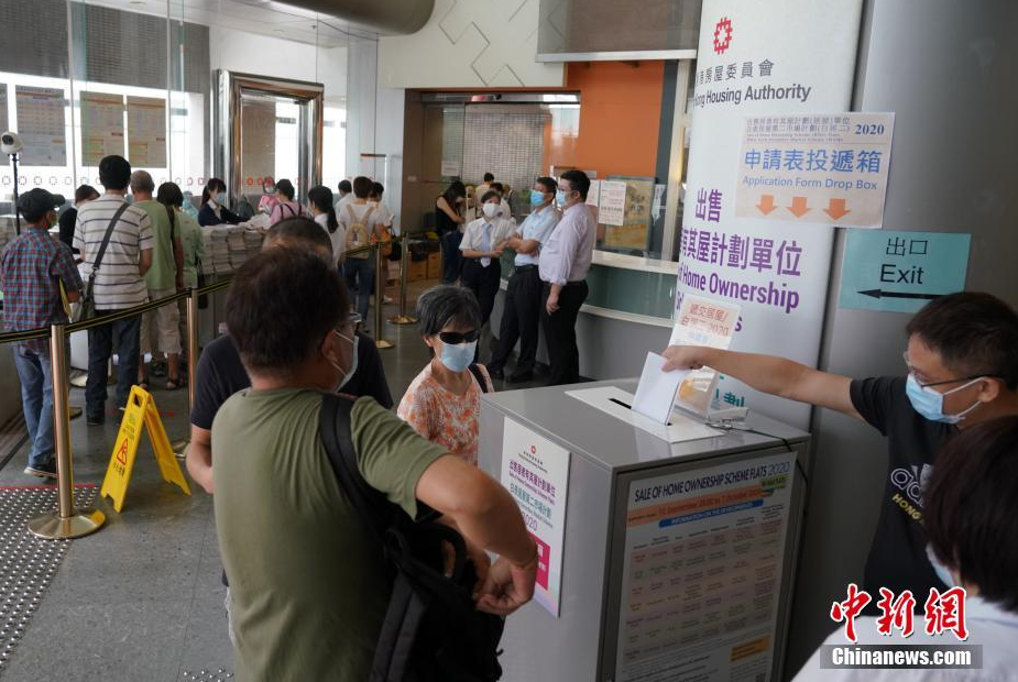 9月10日,香港新一期居屋及白居二(白表居屋第二市场计划)开始接受申请。众多市民在房委会客务中心门前排队领取申请表。受新冠肺炎疫情影响,展示有关楼盘建筑模型与室内间隔模型的客务中心展览厅暂停开放。图为有市民第一天就提交了申请表。中新社记者 张炜 摄