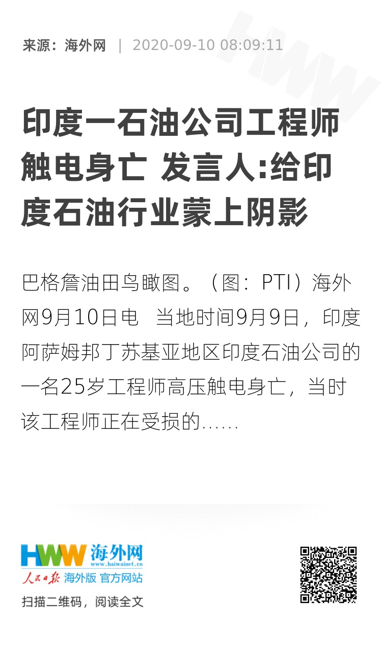 海外网9月10日电 当地时间9月9日,印度阿萨姆邦丁苏基亚地区印度石油公司的一名25岁工程师高压触电身亡,当时该工程师正在受损的天然气井工作。