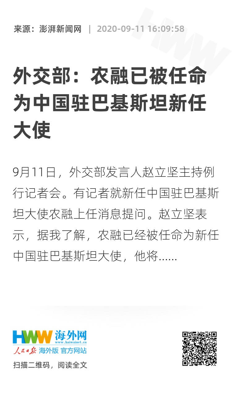 赵立坚表示,据我了解,农融已经被任命为新任中国驻巴基斯坦大使,他将适时赴任。农融大使的资料大家可以在网上查阅。