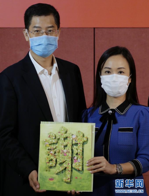 9月10日,在香港九龙维景酒店,香港市民代表(右)为内地核酸检测支援队代表送上“谢”字心意卡。 新华社记者 王申 摄