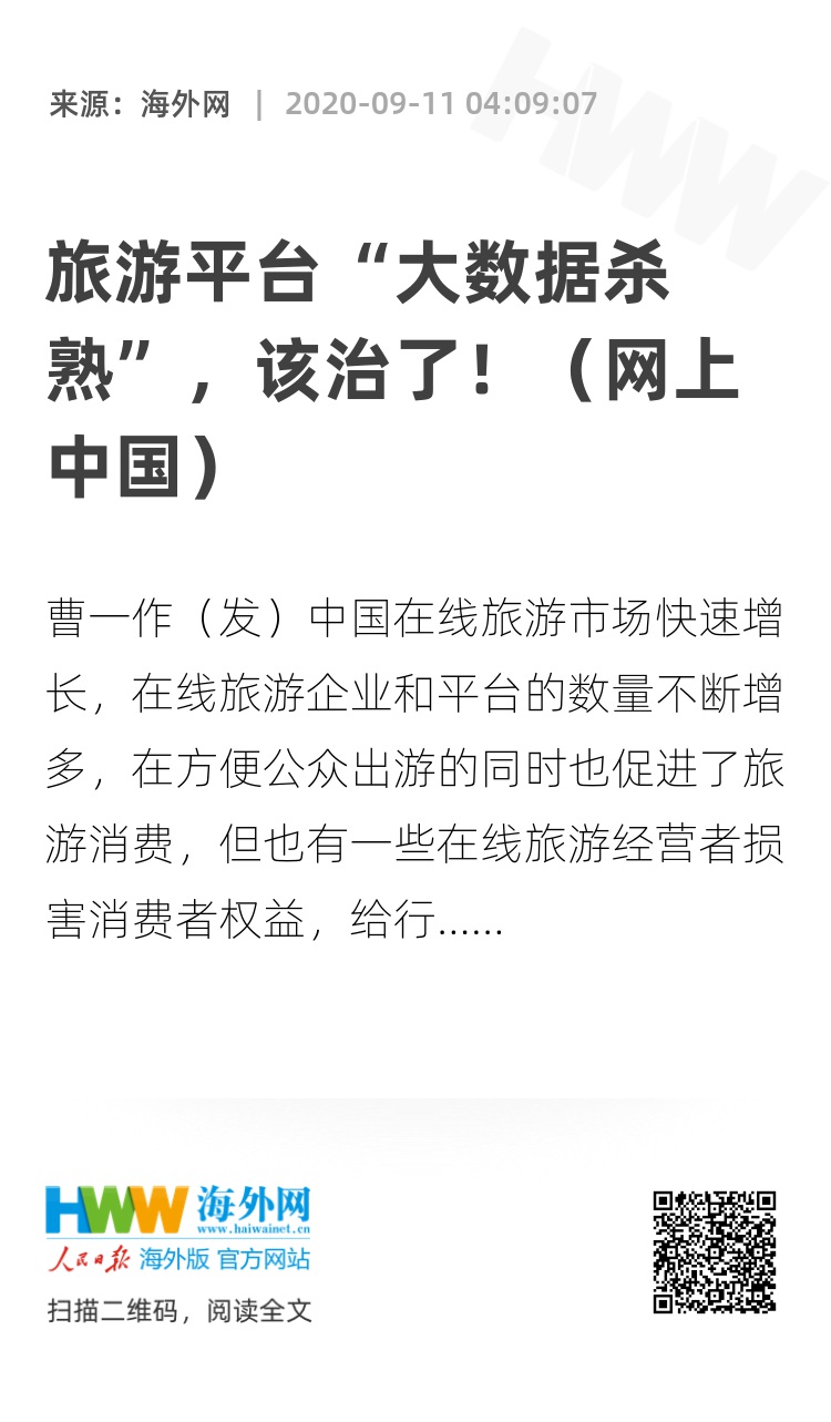 “将‘大数据杀熟’等行业积弊纳入监管,对保障游客消费权益,促进旅游业高质量发展有深远意义。”马蜂窝旅游研究中心负责人冯饶表示,利用行业信息壁垒进行“大数据杀熟”不仅侵犯消费者合法权益,也对市场竞争秩序造成了巨大冲击。《规定》的出台将有利于从根本上遏制这样的违法违规行为,为品质好、服务好的旅游产品提供更多市场空间。
