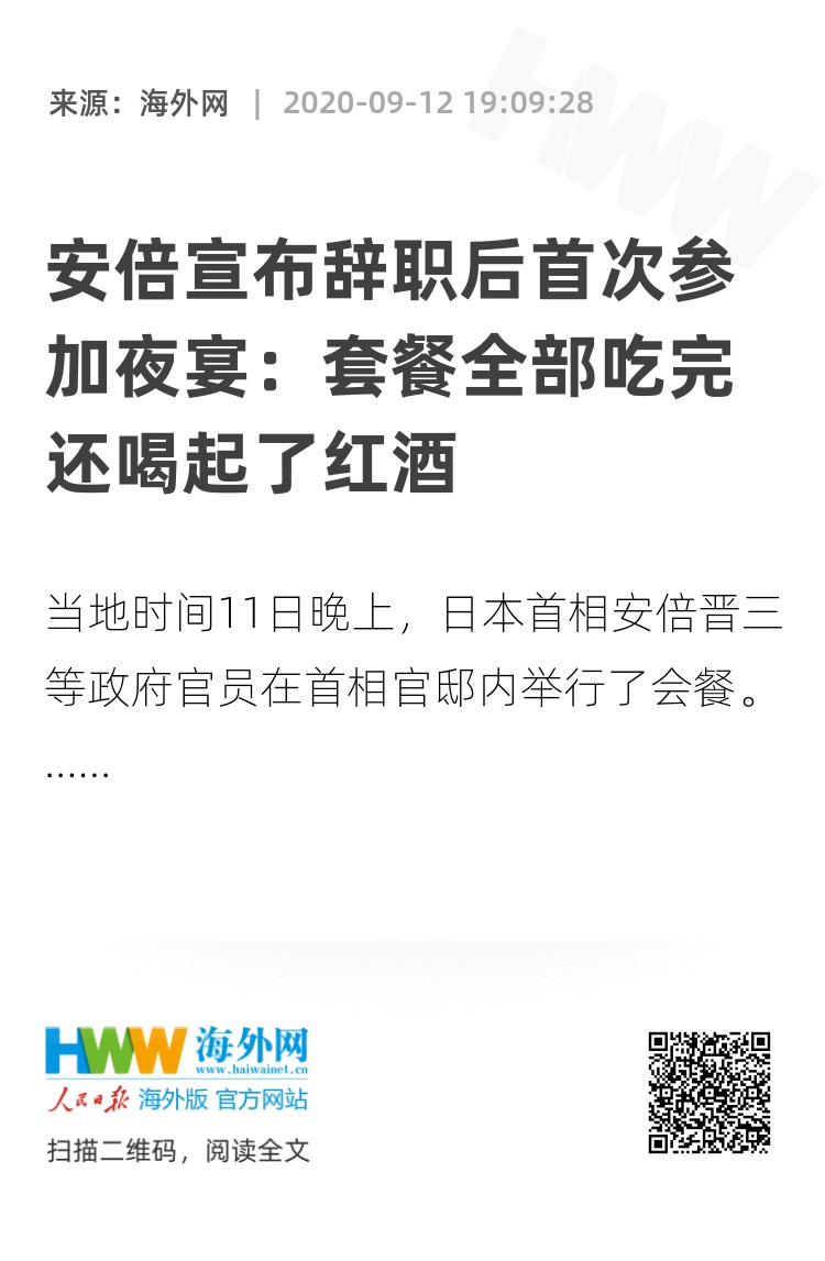 海外网9月12日电 当地时间11日晚上,日本首相安倍晋三和内阁官房参与谷口智彦等政府官员在首相官邸内举行了会餐。据谷口称,安倍吃完了套餐料理,还喝了红酒。首相行程表显示,这是安倍自8月28日宣布辞职以来首次参加夜宴。