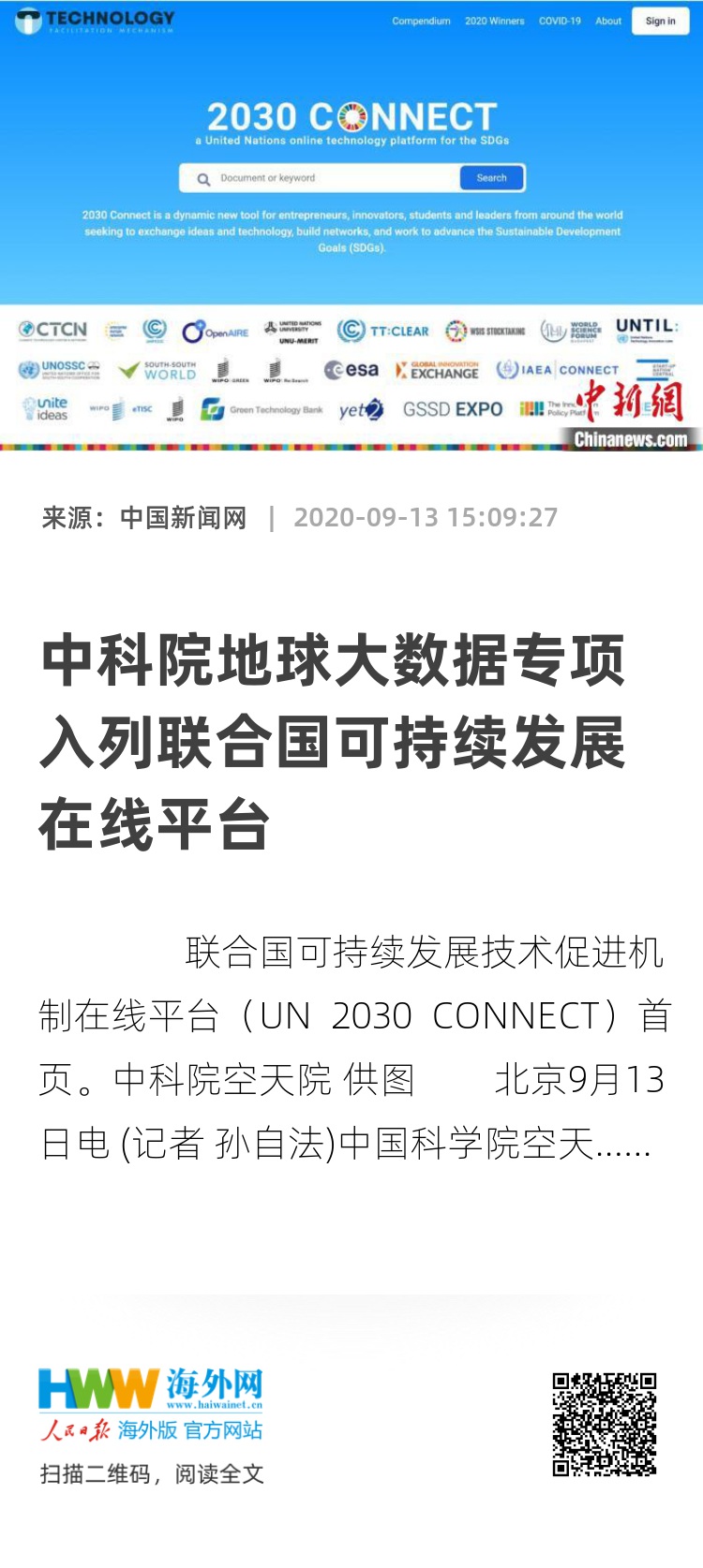 中新网北京9月13日电 (记者 孙自法)中国科学院空天信息创新研究院(中科院空天院)13日发布消息说,在第75届联合国大会开幕前夕,联合国可持续发展技术促进机制在线平台(UN 2030 CONNECT)已将中科院地球大数据专项列为其合作伙伴和技术支持机构。