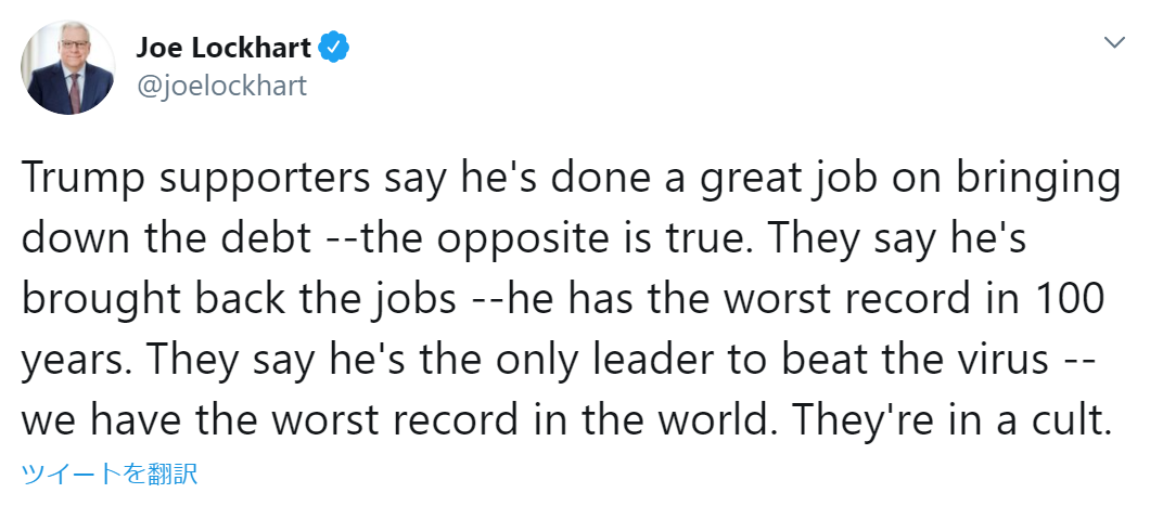 “特朗普的支持者表示,他在降低债务方面做得很好,但事实恰恰相反。他们说他把工作岗位带回来了—但他的记录是100年来最差的。他们说他是唯一战胜病毒的领导人--我们的记录却依旧是世界上最差的。他们就是盲目崇拜。”