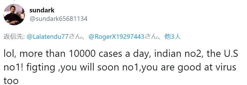 “哈哈,一天超过10000例确诊病例,印度排第二,美国排第一!加油,印度很快就会成为第一了,印度也很‘擅长’应对病毒。”