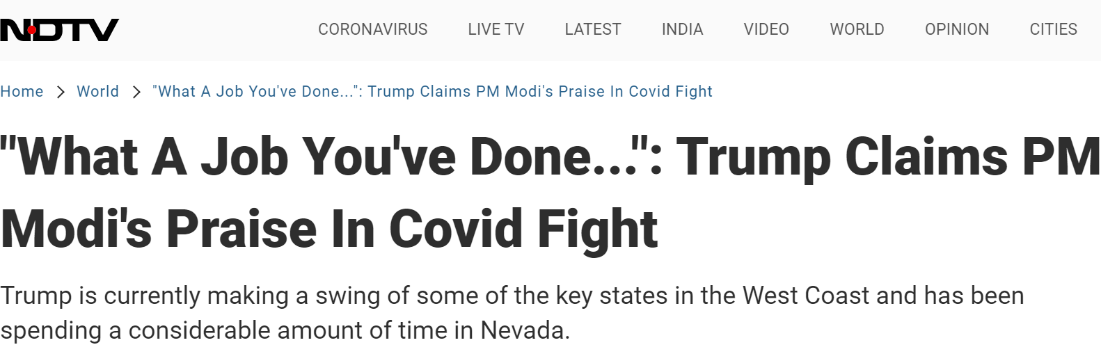 NDTV:“您很好地完成了工作...”,特朗普说莫迪称赞了他对新冠的应对