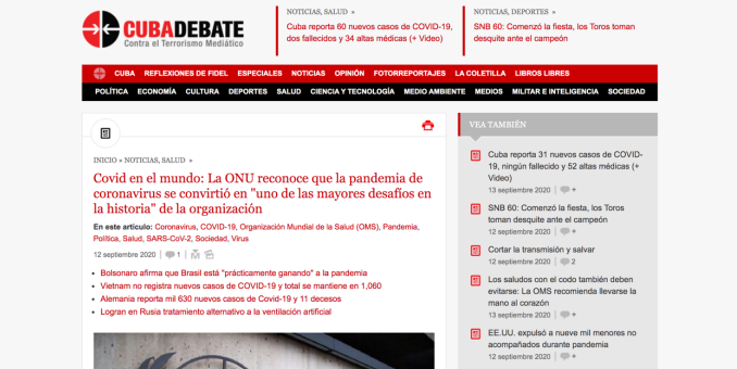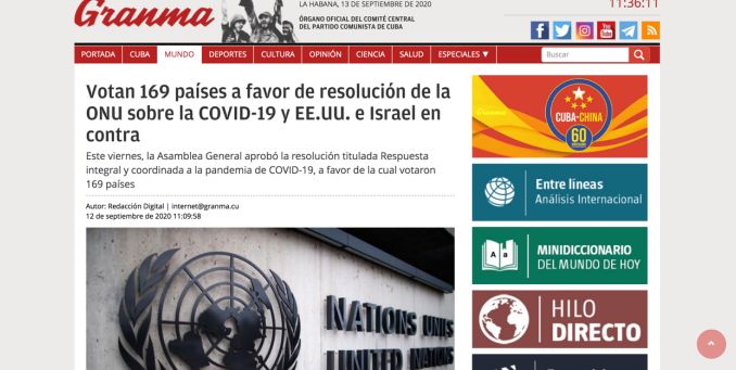 联合国大会通过决议,敦促会员国通过加强国际合作与团结互助应对新冠肺炎疫情。古巴各大主流媒体对此进行了广泛关注和报道,对该决议内容表示支持,并批评美国采取单方面制裁措施。