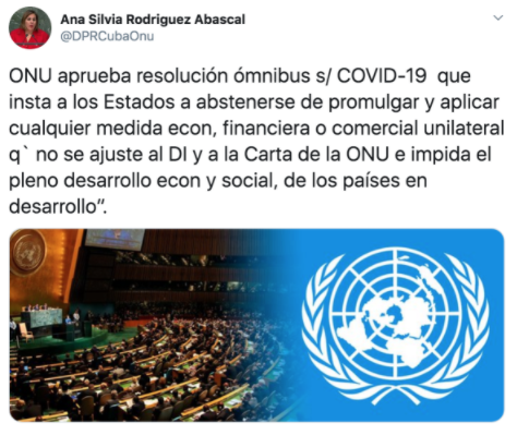 古巴拉美通讯社报道称,该决议敦促各国在当前全球疫情蔓延形势下避免颁布和采取任何违反国际法的措施。古巴驻联合国常任代表安娜·西尔维娅·罗德里格斯·阿巴斯卡尔在其个人社交媒体上发文对这一决议表示支持,并呼吁摒弃任何不符合国际法和《联合国宪章》的单方面经济、金融和贸易制裁措施,阻碍发展中国家经济和社会的全面发展。