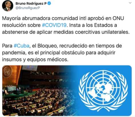 古巴外长布鲁诺·罗德里格斯在社交网络发文称,国际社会以绝对压倒性多数在联合国通过了这项关于应对新冠肺炎疫情的决议,敦促各国不要采取单方面强制性措施。对于古巴来说,疫情期间美国加剧对古封锁是该国获取医疗物资和设备的主要障碍。