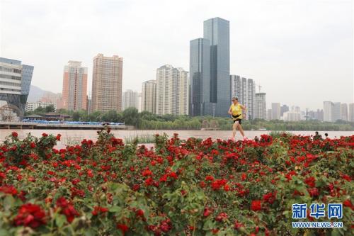 8月7日,一名市民在黄河兰州段北岸的兰州马拉松公园跑步锻炼。新华社记者多蕾摄