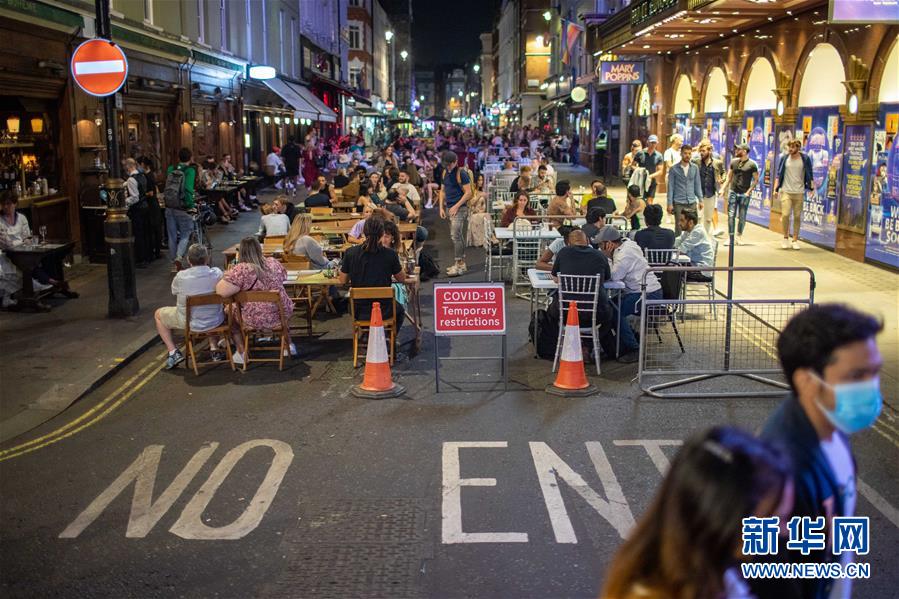 9月14日,人们在英国伦敦SOHO区一处临时占道改造成的户外餐区就餐。 根据英国首相约翰逊宣布的疫情防控新举措,自9月14日起,除少数情况外,日常社交场合中的聚集人数不得超过6人,室内室外均适用,违者可能面临罚款等处罚。不过,学校和工作场合等并不受影响。 新华社发(蒂姆·爱尔兰摄)