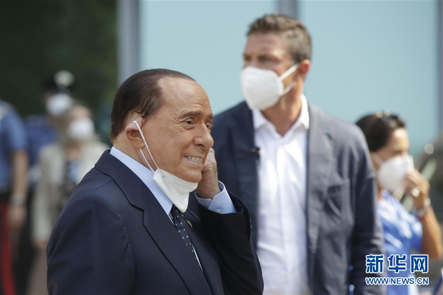 9月14日,在意大利米兰,意前总理贝卢斯科尼走出医院。 因感染新冠病毒入院治疗的意大利前总理贝卢斯科尼14日出院。 新华社发