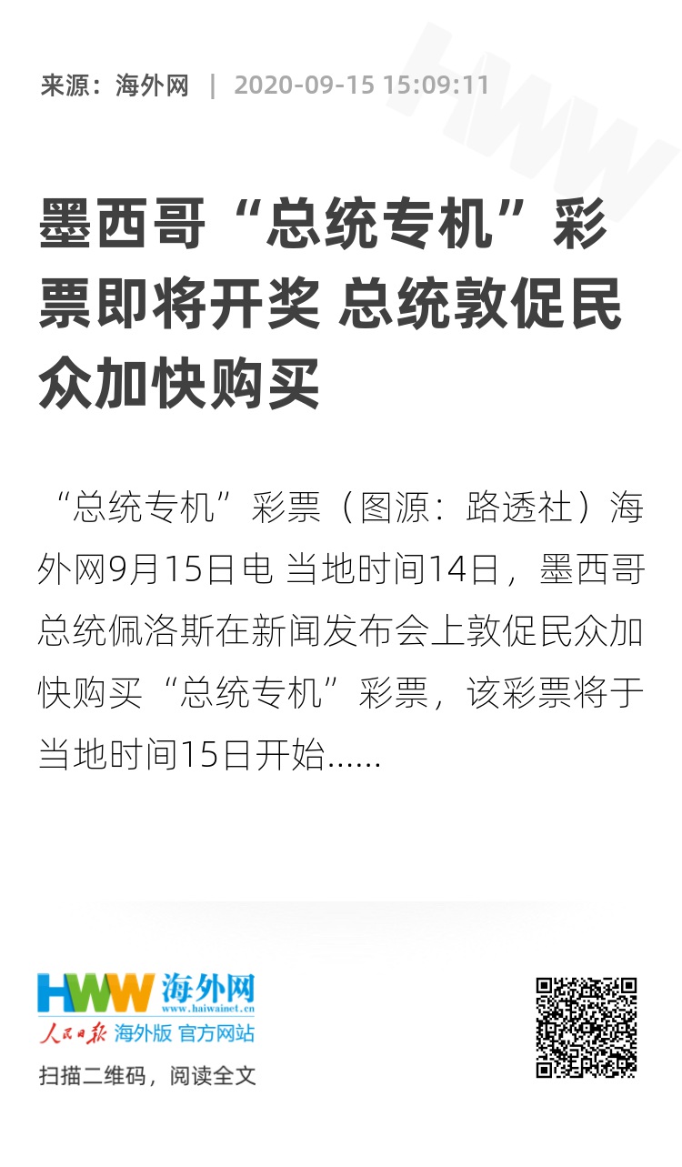 海外网9月15日电 当地时间14日,墨西哥总统佩洛斯在新闻发布会上敦促民众加快购买“总统专机”彩票,该彩票将于当地时间15日开始抽奖,彩票头奖为该国前总统涅托购买的波音787梦幻客机,出售彩票所筹集的款项全部用于墨西哥的医疗事业。