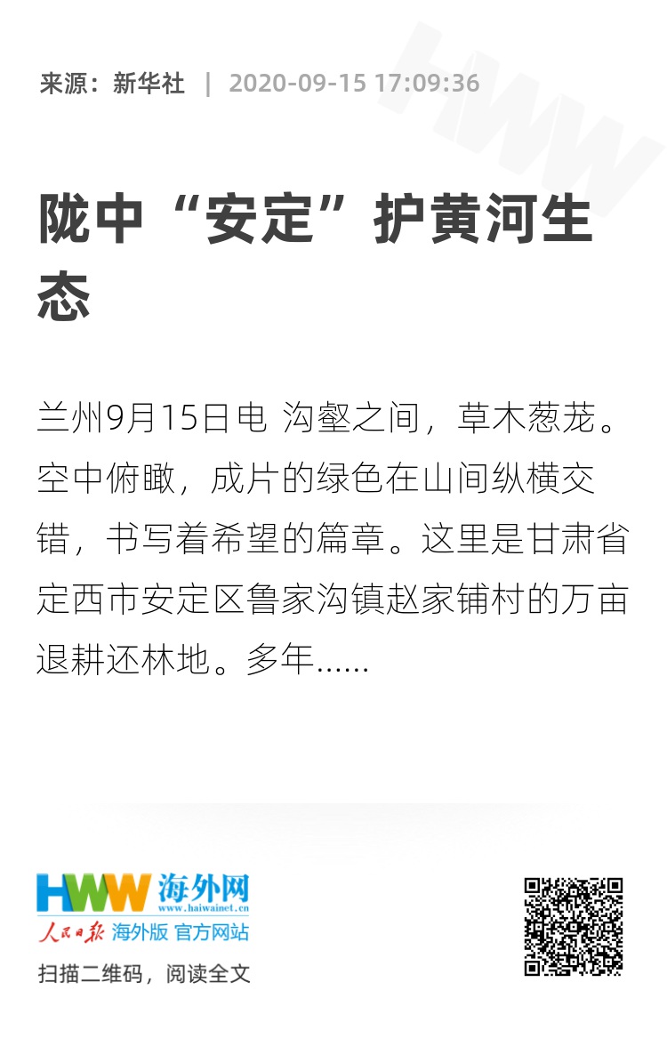 新华社兰州9月15日电 沟壑之间,草木葱茏。空中俯瞰,成片的绿色在山间纵横交错,书写着希望的篇章。