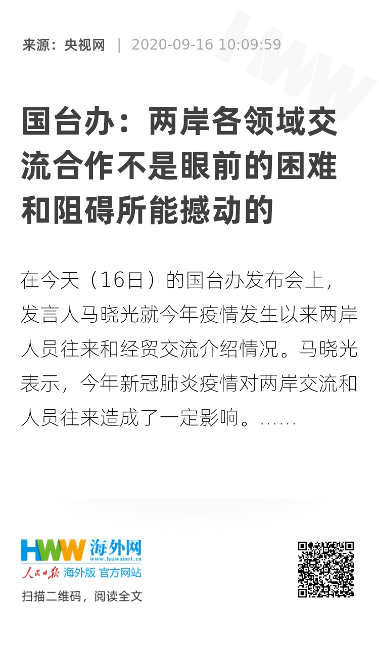 在今天(16日)的国台办发布会上,发言人马晓光就今年疫情发生以来两岸人员往来和经贸交流介绍情况。马晓光表示,今年新冠肺炎疫情对两岸交流和人员往来造成了一定影响。同时,民进党当局对两岸交流往来的阻挠禁限变本加厉。他们无理阻挠滞留大陆的台胞和亲属返回台湾,至今仍然全面禁止大陆民众赴台,强行实施所谓的“反渗透法”,制造“绿色恐怖”,对台湾民众和民间团体参加正常的两岸交流活动动辄威胁恫吓。两岸交流符合两岸同胞共同愿望和利益福祉,是任何人任何势力都禁止不了、阻挡不住的。在今年疫情最严峻的1至2月,仍然有10万多名台胞来到大陆。疫情发生以来,两岸同胞克服暂时困难,通过互联网线上线下相结合的形式,在经济、文化、医疗卫生、教育、青年、基层、民间信仰等领域和界别成功举办了一系列不同主题的交流活动,延续了两岸交流的势头。