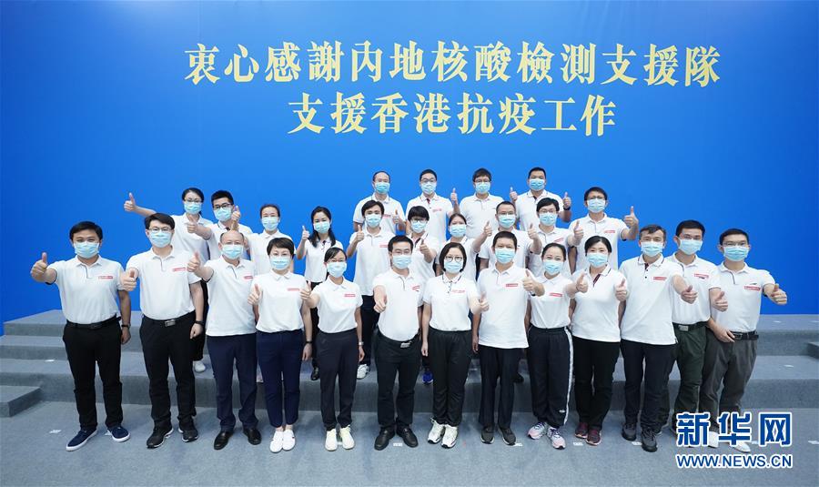 9月15日,内地核酸检测支援队队员在香港特区政府举行的欢送仪式上合影。新华社记者 吕小炜 摄