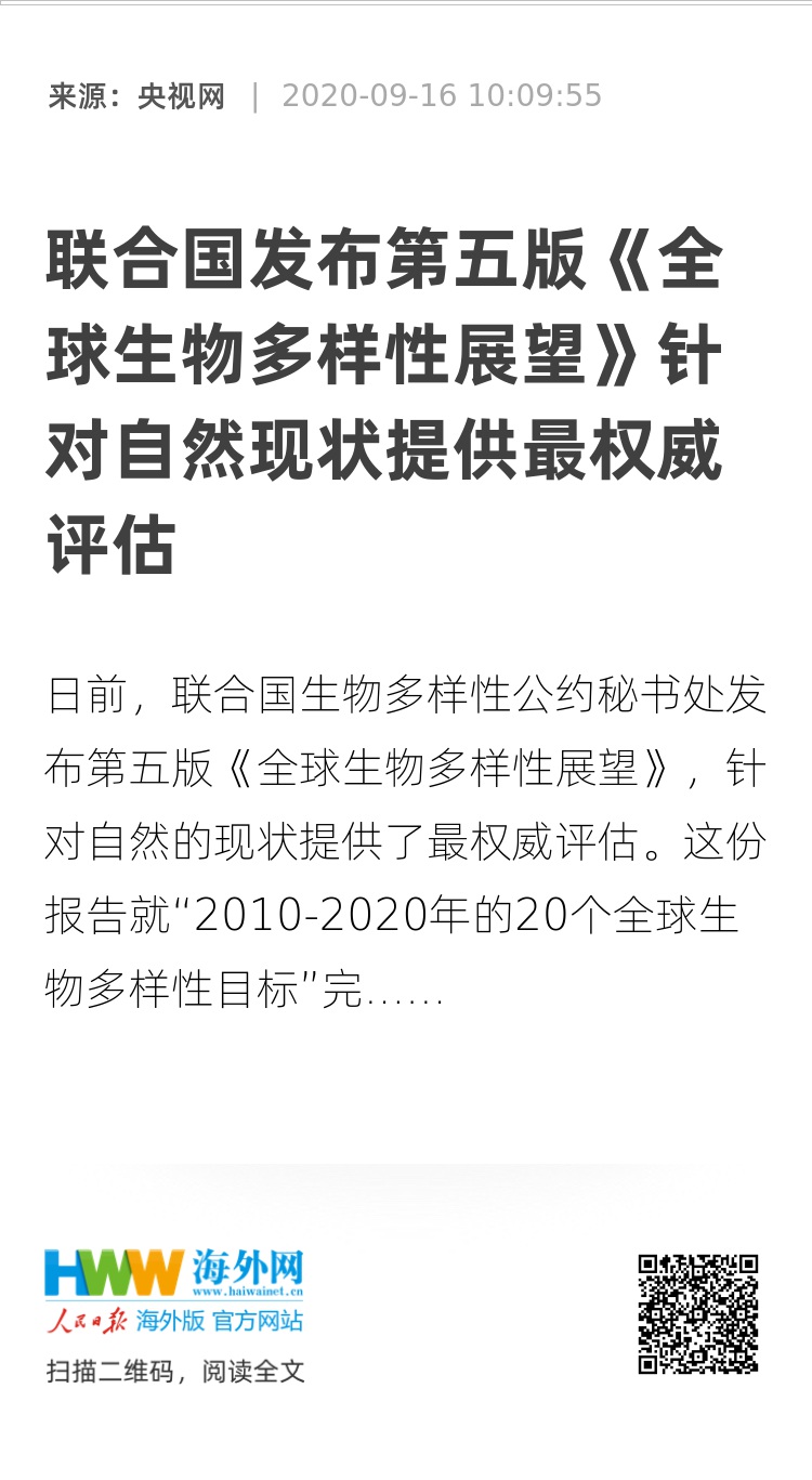 日前,联合国生物多样性公约秘书处发布第五版《全球生物多样性展望》,针对自然的现状提供了最权威评估。这份报告就“2010-2020年的20个全球生物多样性目标”完成情况和所取得进展发布最终报告单,并提供了经验教训和最佳做法。《全球生物多样性展望5》强调了采取行动减缓并遏制进一步损失的紧迫性,并重点列举了一些行之有效的措施,助力世界实现协商一致的愿景:到2050年“与自然和谐相处”。