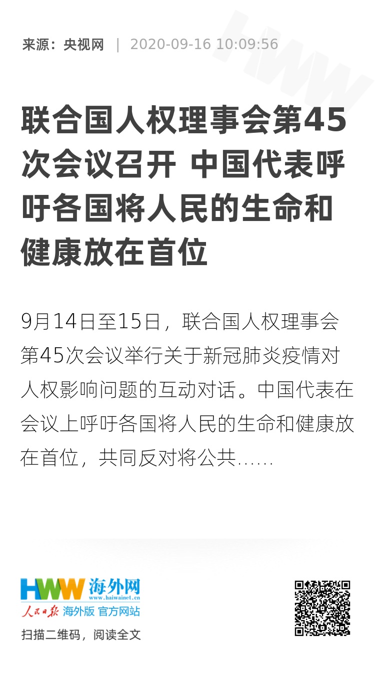 9月14日至15日,联合国人权理事会第45次会议举行关于新冠肺炎疫情对人权影响问题的互动对话。中国代表在会议上呼吁各国将人民的生命和健康放在首位,共同反对将公共卫生问题政治化。